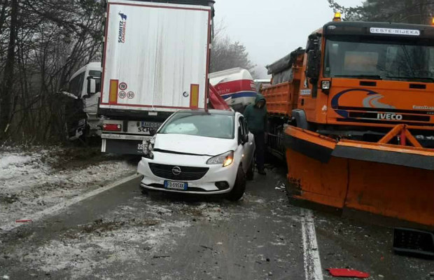 Poledica u raznim dijelovima Primorsko-goranske županije stvarala je probleme u prometu tijekom subotnjeg jutra, a dogodila se i prometna nesreća kakva se dugo ne pamti na ovom području.