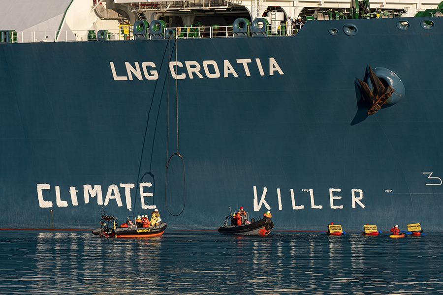 Približivši se gumenim čamcima, na bočnoj strani terminala ispisali su slovima “CLIMATE KILLER”, u prijevodu “ubojica klime”.