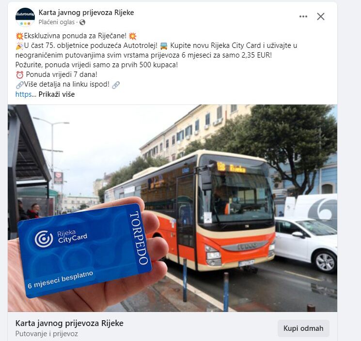 KD Autotrolej obavještava sve korisnike kako se na društvenim mrežama pojavio lažni oglas. Riječ je o prevari i nepostojećoj ponudi kartice Rijeka City Card. Sve informacije i ponude KD Autotrolej nalaze se na njihovoj web stranici, kao i službenoj Facebook stranici.