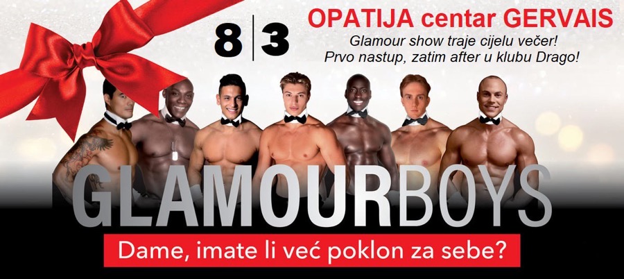 Uživajte 8.3. u elegantnoj atmosferi dvorane Gervais uz jedinstveni nastup najpoznatijih francuskih plesača Glamour Boysa. Nakon nastupa slijedi veliki Glamour Show after-party u klubu Drago (donja etaža centra Gervais) na koji se ulazi sa ulaznicom Glamour Showa i gdje će se damama osobno pridružiti plesači, a zabava će trajati do kasnih sati.