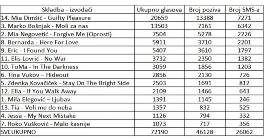 Nakon subotnje pobjede Mije Dimšić s pjesmom “Guilty Pleasure” Hrvatska radiotelevizija predstavila je službene rezultate glasovanja.