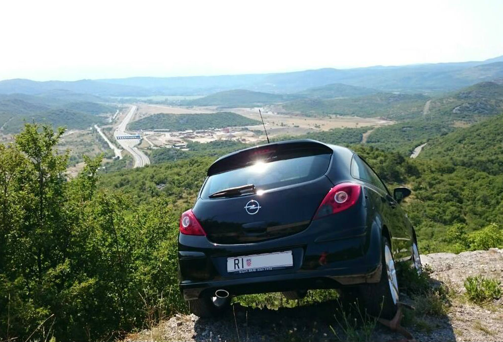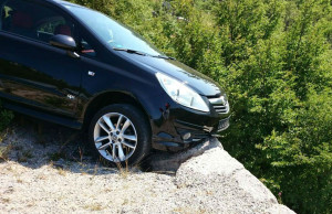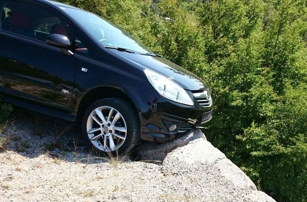 Na njima se može vidjeti crna Opel Corsa riječkih registracijskih oznaka kako prednjim lijevim dijelom visi iznad provalije.