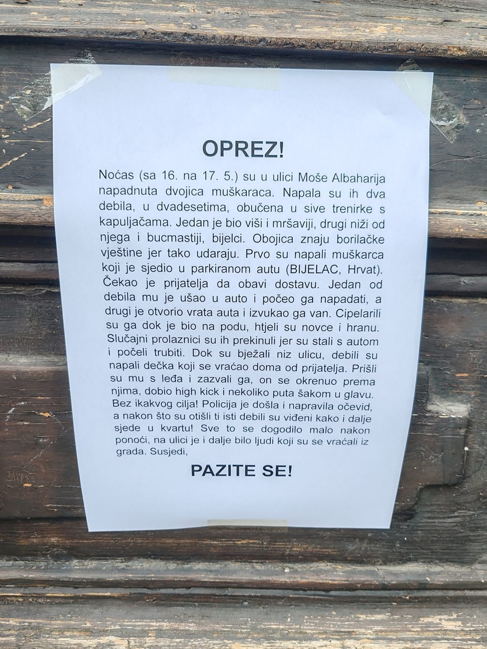 „Pazite se! Na ulici je i dalje bilo ljudi koji su se vraćali iz grada. Susjedi, pazite se!“