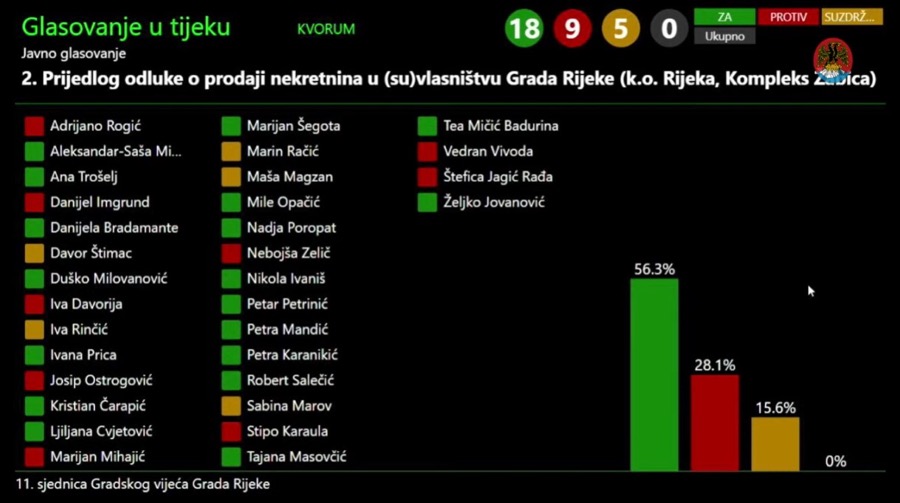 Gradsko vijeće Grada Rijeke je prvo glasalo o prijedlogu vijećnika Davora Štimca o odgodi donošenja Odluke o prodaji, koju nije prihvatilo, a zatim većinom glasova prihvatilo 85 milijuna kuna vrijednu ponudu tvrtke Best in Parking – razvoj za kupnju nekretnina radi izgradnje višenamjenske građevine “Kompleks Žabica”.