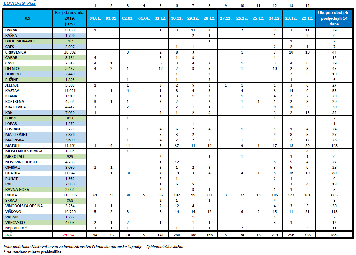 U proteklih 14 dana na području PGŽ s 282 tisuća stanovnika zabilježeno je 1863 slučajeva zaraze koronavirusom, a naravno da daleko najveći dio toga otpada na Grad Rijeku koja službeno ima 116 tisuća stanovnika. Od 22.12.2020. do 04.01.2021. u Rijeci je registrirano 885 slučajeva zaraze koronavirusom.