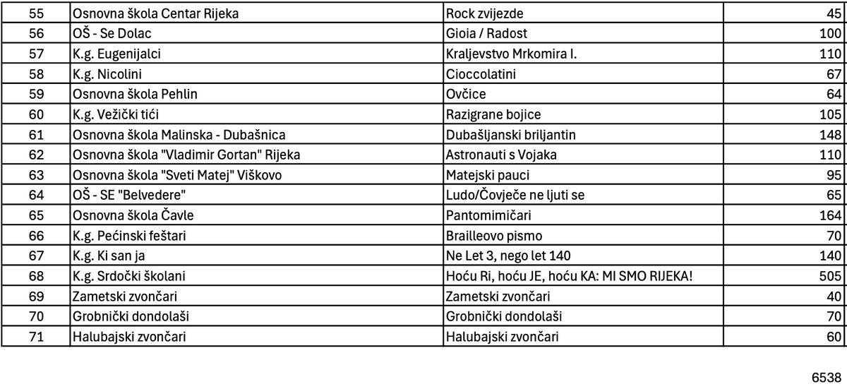 U povorci se sudjelovati ukupno 71 grupa u kojima će biti ukupno 6.538 mališana. Daleko najbrojnija karnvelaska grupa bit će Srdočki školani koja će imati 505 sudionika, a masku su nazvali “Hoću Ri, hoću JE, hoću KA: MI SMO RIJEKA!”. Više od stotinu sudionika u svojoj grupit imat će karnevalske grupe Dječji vrtić Vidrice, Obrti za dnevnu skrb o djeci, Veseli Orepčići, Dječji vrtić Poneštrica, Dječji vrtić Pčelice, Škrljevo i dječji vrtić Loptica, Viškovo, Veseli Rastočinci, Mažoretkinje otoka Krka i prijatelji, Dječji vrtić Viškovo, Dječji vrtić Matulji, Osnovna škola Kantrida, Karnevalska grupa Teslići, Zametske maškarice, Osnovna škola Fran Franković, Broštulin – Osnovna škola Kostrena, OŠ – Se Dolac, Eugenijalci, Vežički tići, Osnovna škola Malinska – Dubašnica, Osnovna škola “Vladimir Gortan” Rijeka, Osnovna škola Čavle i Ki san ja.