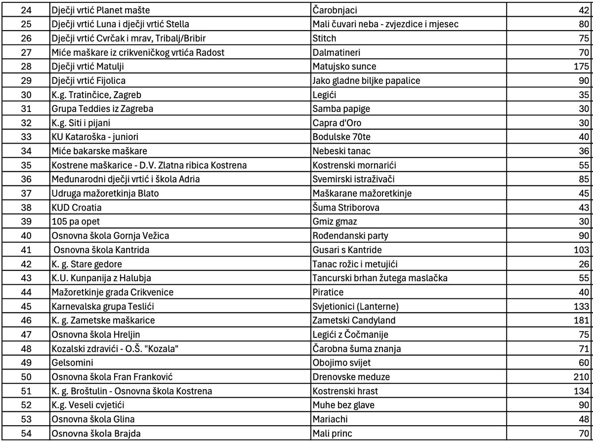 U povorci se sudjelovati ukupno 71 grupa u kojima će biti ukupno 6.538 mališana. Daleko najbrojnija karnvelaska grupa bit će Srdočki školani koja će imati 505 sudionika, a masku su nazvali “Hoću Ri, hoću JE, hoću KA: MI SMO RIJEKA!”. Više od stotinu sudionika u svojoj grupit imat će karnevalske grupe Dječji vrtić Vidrice, Obrti za dnevnu skrb o djeci, Veseli Orepčići, Dječji vrtić Poneštrica, Dječji vrtić Pčelice, Škrljevo i dječji vrtić Loptica, Viškovo, Veseli Rastočinci, Mažoretkinje otoka Krka i prijatelji, Dječji vrtić Viškovo, Dječji vrtić Matulji, Osnovna škola Kantrida, Karnevalska grupa Teslići, Zametske maškarice, Osnovna škola Fran Franković, Broštulin – Osnovna škola Kostrena, OŠ – Se Dolac, Eugenijalci, Vežički tići, Osnovna škola Malinska – Dubašnica, Osnovna škola “Vladimir Gortan” Rijeka, Osnovna škola Čavle i Ki san ja.