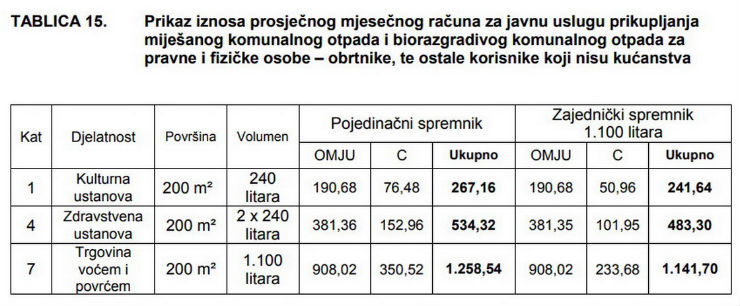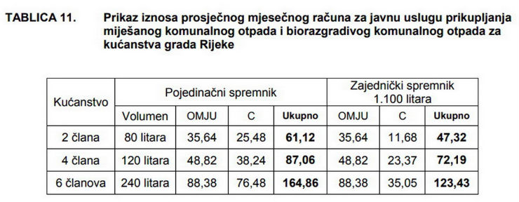 To znači da će uz minimalnu učestalost odvoza otpada od jednom tjedno, domaćinstvo od dva člana koje ima pojedinačni spremnik od 80 litara plaćati mjesečno 61,12 kuna, od 120 litara 87,06 kuna, a od šest članova 164,86 kuna. Cijene odvoza otpada iz zajedničkih spremnika nešto su niže, što znači da će se domaćinstvo od dva člana u višestambenim zgradama svoj udio mjesečno plaćati 47,32 kune, kućanstvo od četiri člana 72,19 kuna, a domaćinstvo od šest članova 123,43 kune.