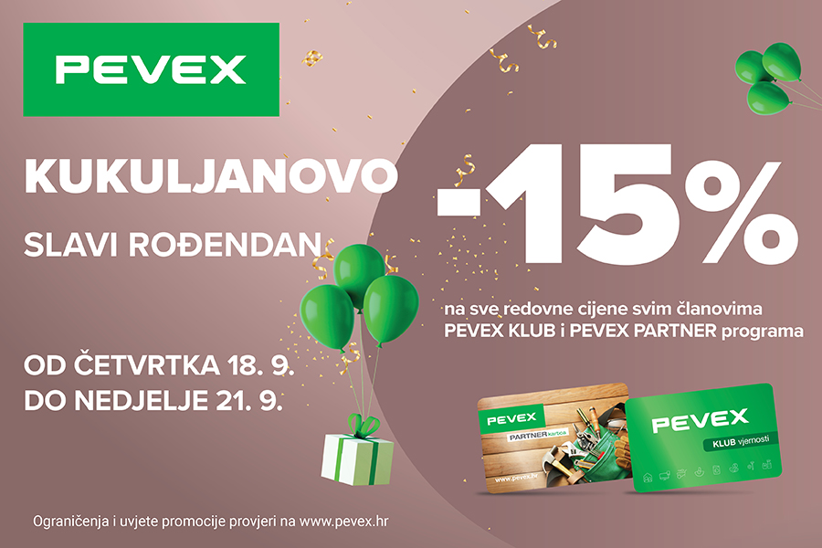 Prodajni centar PEVEX Kukuljanovo slavi rođendan povodom kojeg časti svoje kupce s 15% popusta na sve redovne cijene uz PEVEX KLUB i PEVEX PARTNER karticu. Od četvrtka 18.9. do nedjelje 21.9. kupci osim popusta na sve redovne cijene od 15%, mogu iskoristiti i besplatnu kombi dostavu na iznos računa iznad 500 eura za udaljenost do 10 kilometara (1. zona).