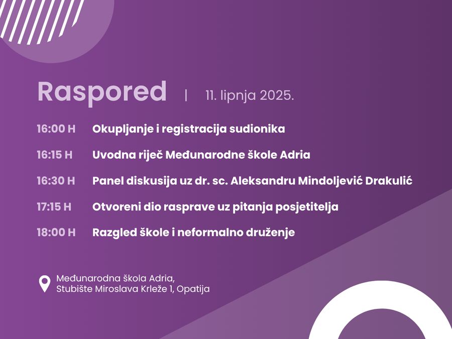 U srijedu, 11. lipnja u 16:30 sati, Međunarodna škola Adria organizira panel-raspravu s kliničkom psihologinjom dr. sc. Aleksandrom Mindoljević Drakulić o sve većem pritisku na djecu u školama i posljedicama koje taj pritisak ostavlja na njihovo mentalno zdravlje.
