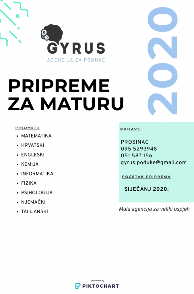 Gyrus agencija za poduke Vam nudi pripreme za maturu iz matematike, fizike, kemije, biologije, psihologije, hrvatskog, engleskog i informatike s odličnim dugogodišnjim rezultatima.