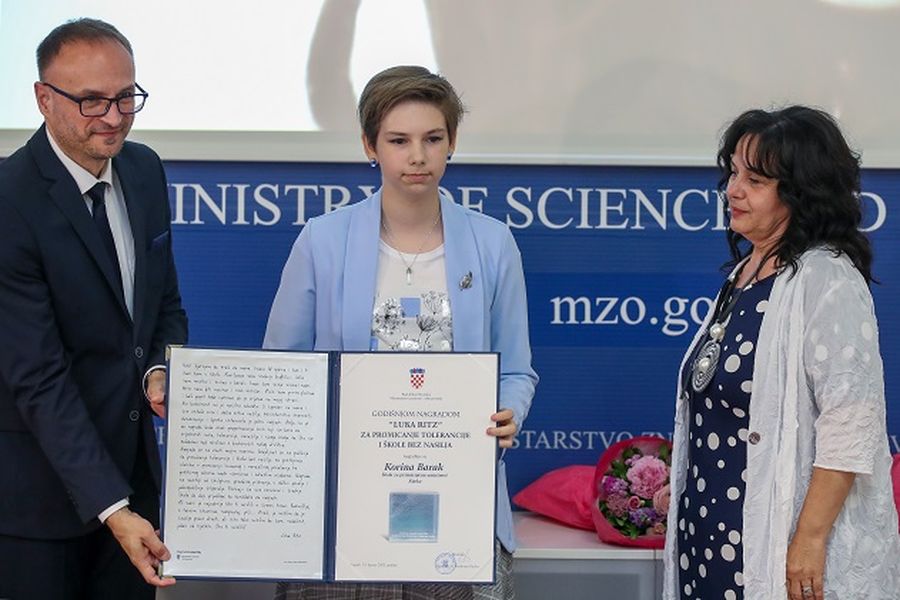 Godišnje nagrade “Luka Ritz” za promicanje tolerancije i škola bez nasilja uručene su u ponedjeljak u Ministarstvu znanosti i obrazovanja (MZO) Šimunu Lončaru u kategoriji osnovnih škola i Korini Barak u kategoriji srednjih škola.