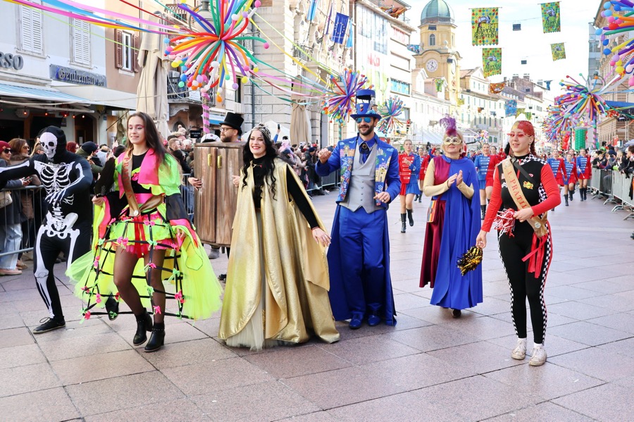 Povorku je predvodila svečana grupa u kojoj su, uz gradonačelnicu Ivu Rinčić, bili zamjenici Vedran Vivoda i Aleksandar Saša Milaković, direktor Turističke zajednice Rijeke Petar Škarpa, meštar karnevala Sandi Pribanić, kraljica karnevala Pia Vujović te njezine pratilje. Gradonačelnica se za ovu prigodu pojavila odjevena u boje tradicionalne riječke zastave, dok su zamjenici nosili prepoznatljive maske – “kosturi iz ormara”.