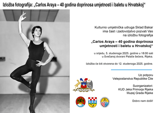 U Svečanoj dvorani Palače šećera u Rijeci (Krešimirova 28 ) u srijedu, 5. studenoga 2025. godine u 18:00 sati bit će otvorena izložba „Carlos Araya – 40 godina doprinosa umjetnosti i baletu u Hrvatskoj“