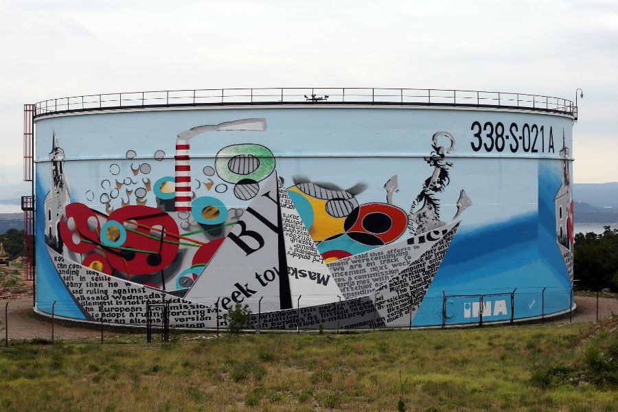 Nakon tri mjeseca napornog rada, danas je i službeno predstavljen atraktivni oslikani spremnik 338-S-021 A Rafinerije nafte Rijeka! Najveći spremnik s muralom u Hrvatskoj djelo je lokalnog umjetnika Edija Gustina Maske, a njegovi motivi mora i broda će u budućnosti krasiti vizuru Općine Kostrena i grada Rijeke u suradnji s kojima je INA i realizirala ovaj projekt.